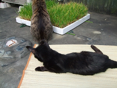 あまったれが草を食べている最中COOちゃんはあまったれのしっぽで遊んでいたんですよ~^^ 2匹は屋上でコロンコロンと体を左右にして気持ち良さそう~な時間を過ごしていました。楽しそう~!