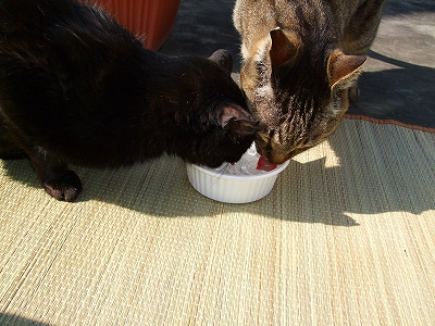 お水をいっしょに飲んでいるところです。あまりの暑さに凄い勢いでごくごく。。。