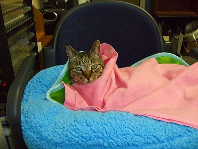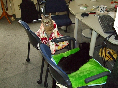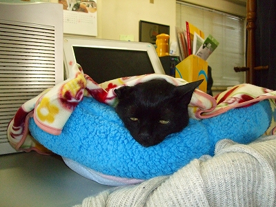 あまったれ君は椅子にお座布団の上に毛布引いてホカロン入れて寝ています^^