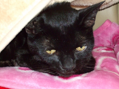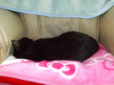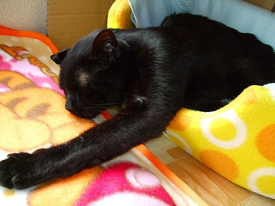 こんにちは!COOちゃん体半分ベットから出ていて左前足だけ伸びて寝ています
